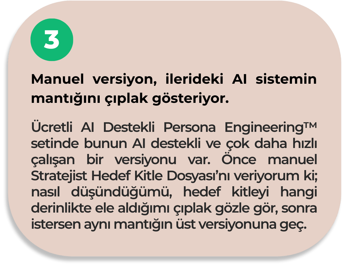 1–2 saatlik odaklı bir doldurma süreci, haftalarca sürecek hedef kitle tartışmalarının ve kör test kampanyalarının yerini alır. Dosya hazır olduğunda, paneli rastgele rakamlar değil, önceden düşündüğün persona hipotezleri üzerinden okursun.