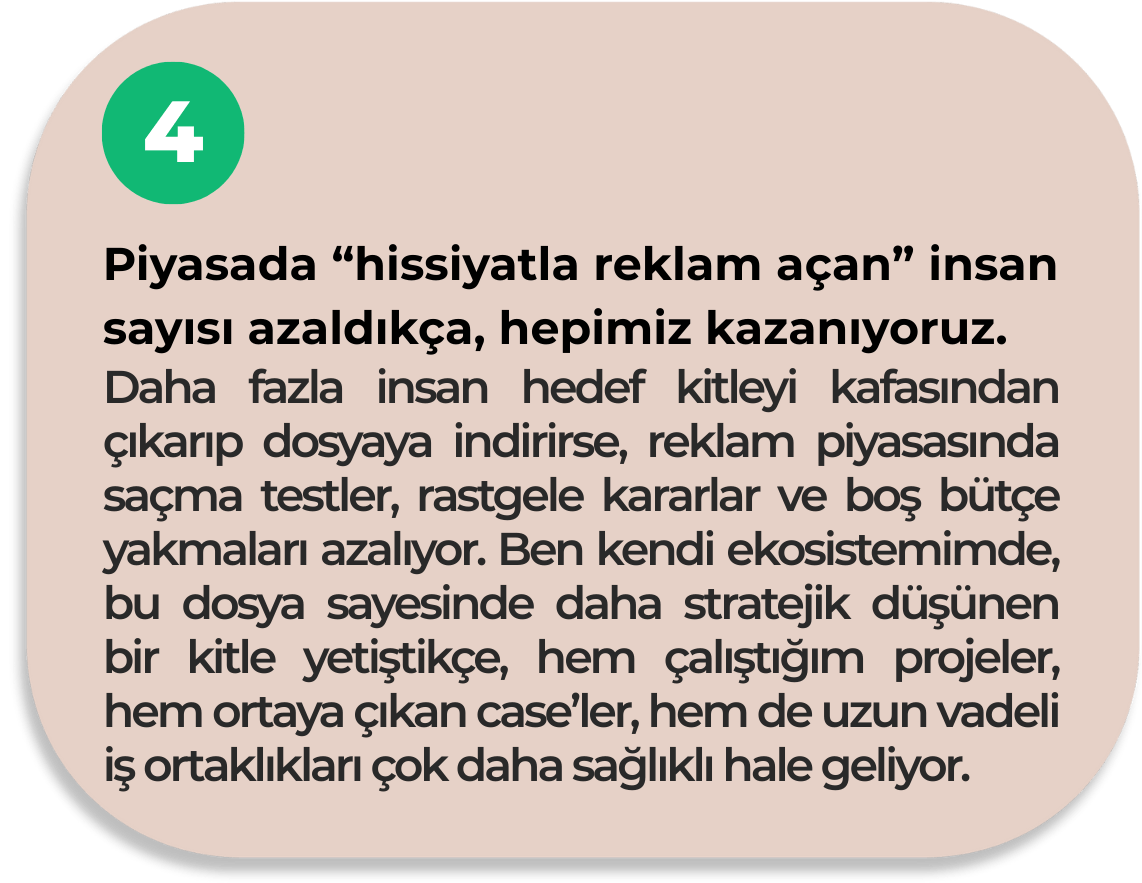 Yeni reklam açarken, kreatif yazarken veya teklif tasarlarken ekipte kim olursa olsun, önce bu dosyaya bakarsınız. Böylece herkes “kendi kafasındaki” değil, aynı stratejik hedef kitle tanımından konuşur.